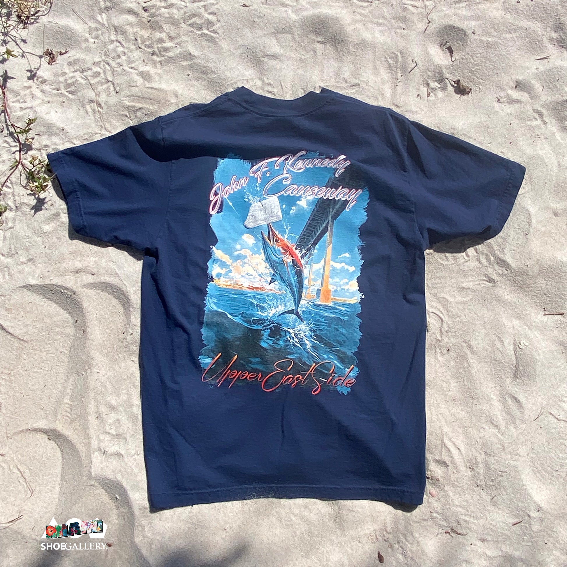 - Design: The back features an artistic depiction of the iconic John F. Kennedy Causeway, complete with a marlin leaping from vibrant blue waves and catching the sniffles on the way out! "Upper East Side" script adds a touch of local pride.